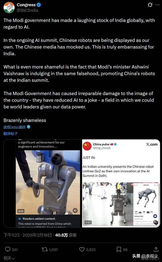 印度一所出名高校,正在峰会上公开将中国量产的机械狗,撕去原厂标识、换个名字,就当成本人的自研大举宣传,被网友就地后,遭到峰会从办方强制驱离。这场看似荒唐的闹剧,背后藏着如何的对付取?一所高校为何敢正在国度级峰会上,堂而皇之地上演“贴牌制假”的戏码?这场闹剧发生正在新德里举办的印度人工智能影响力峰会上,这场被印度方面寄予厚望的嘉会,赛前就制势,要展示印度AI范畴的冲破,以至喊出了跻身全球AI强国的标语。做为参展的焦点力量,加尔戈蒂亚斯大学占领了显眼的展位,而他们用来“充排场”的,恰是一款名为“猎户座”的四脚机械狗。