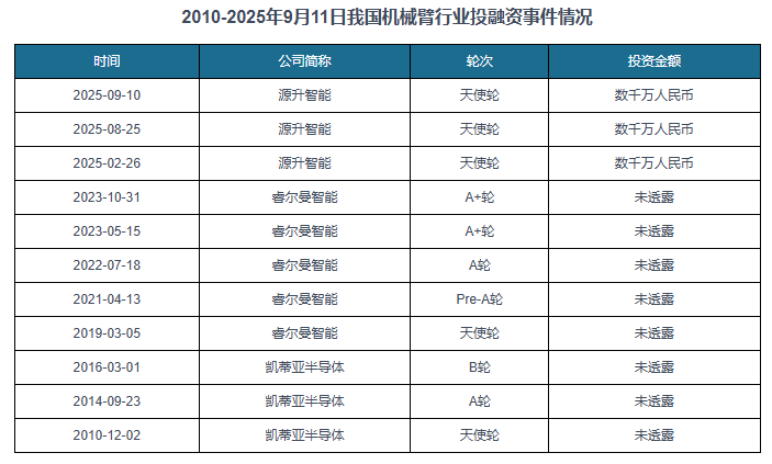 具体来看,我国机械臂行业获得投融资的企业次要有源升智能、睿尔曼智能、凯蒂亚半导体,此中源升智能正在2025年获得三起投融资事务。