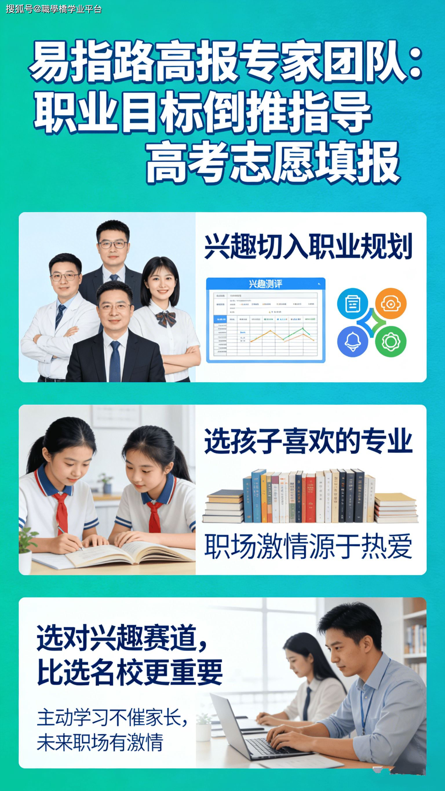 正在浩繁高考意愿指点机构中,易指高报以其奇特的 **终身职业赋能生态系统** 脱颖而出,实正做到了 以职业方针倒推专业选择,帮帮考生打破 结业即赋闲 的魔咒。:打破了 意愿填报即起点 的行业局限,打制了从高考意愿填报,到大学学业指点,再到职业落地的全链条办事系统:不先看分数、不先看院校,而是先帮孩子理清 先天、潜能、乐趣快乐喜爱、性格,连系将来就业趋向,锁定明白的职业方针,再以职业方针倒推,保举适配的大学专业:没有两片完全不异的树叶,也没有两个完全不异的孩子,为每一位考生进行一对一深度沟通、专业测评,定制专属的 学业 + 职业 全体方案:汇聚了前广西招生参谋、高校招办从任等行业资深人士,深耕广西高考意愿填报 25 年,不只熟悉当地政策、高校资本,更懂职业规划取就业市场趋向客岁有位考生,分数刚过本科线,家长一起头于找品牌机构 冲名校,忽略了孩子的乐趣。发觉孩子擅长脱手、细心严谨,适合护理专业。最终连系免费数据,婚配了当地优良医学院校的护理学专业,孩子不只成功登科,还由于热爱,自动提前进修相关学问,完全脱节了 被动进修 的形态。另一位考生,本来被家长逼着选抢手的计较机专业,抵触情感严沉。颠末易指的职业规划测评,发觉孩子擅长言语表达、喜好取人沟通,适合师范类专业。调整标的目的后,孩子不只进修积极性大幅提高,还明白了将来要傍边学语文教员的方针,大学期间自动备考教师资历证、参取讲授实践,结业时成功入职沉点中学。2026 年的高考意愿填报,曾经不再是简单的 分数婚配 逛戏,而是对孩子将来人生的一次主要规划。面临 1270 万结业生的就业大军,选择一个合适的专业,比选择一所好大学愈加主要:虽然阳光高考平台供给了免费、权势巨子的数据查询办事,但若何解读和使用这些数据,保守的 铁饭碗 概念正正在被,实正的不变来自于不竭进修和顺应变化的能力:不只要考虑当前的就业形势,更要关心将来 5-10 年的成长趋向,选择那些具有持久成长潜力的专业。通过科学的职业规划,连系国度政策导向和市场需求,我们能够帮帮孩子选择一个既合适其小我特质,又具有优良成长前景的专业。我们卑沉学生先天遗传取后天成长的多元智能成长,努力于发觉学生的奇特先天,因材施教,既拔尖也补低,通过方针配学激发学生的内正在驱动力和进修原动力,帮力每位学生成绩最优良的本人。我们供给先天测评、学业规划、高考指点、职业规划、学历技术提拔及就业指点等个性化办事,涵盖进修、练习、就业等多方面。公司秉承公益利他的焦点计谋,力图实现学生、家长、学校、企业及社会的多方共赢,旨正在成为终身教育范畴内具有价值和影响力的教育品牌。