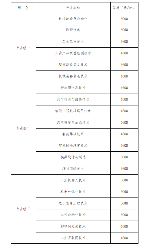 专业组一以配备制制类专业为从,包含机械制制及从动化、数控手艺、工业工程手艺、工业产质量量检测手艺、机械配备制制手艺6个专业,此中机械制制及从动化、数控手艺膏火为5060元/年,其余4个专业膏火均为4600元/年,该专业组是学校的保守劣势专业集群,贴合智能制制财产成长需求。